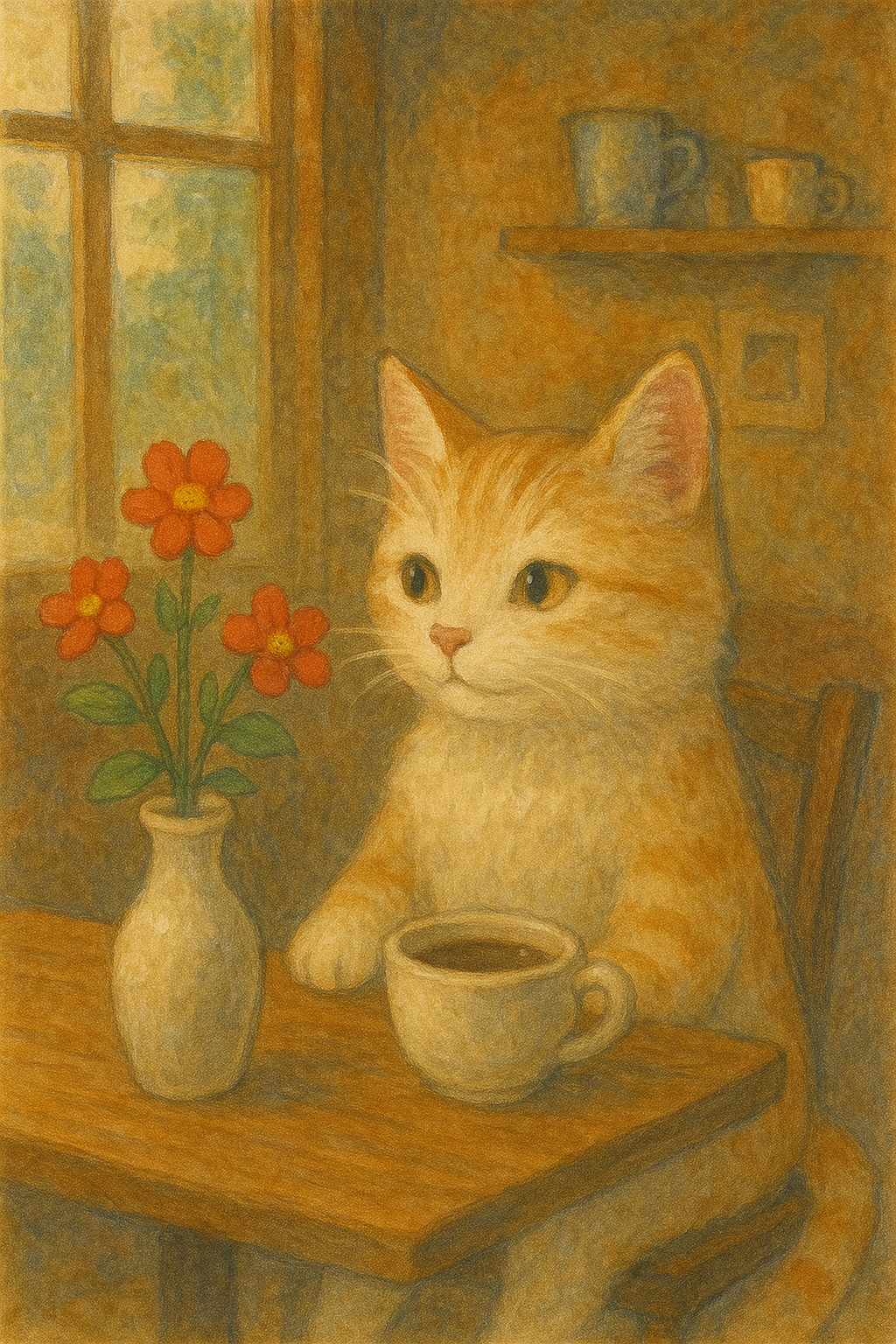 "카페에서 커피를 마시는 고양이를 그림 스타일로 그려줘" - 잠시 기다리면 AI가 이미지를 생성합니다.